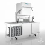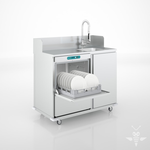 Spülmobil H60V1 - H 640 - große Ausführung. Mit Haubenspülmaschine H 640. Zulauftisch 750x720mm mit Becken 500x400x250mm mit Spritzschutz 250mm. Schlauchpendelbrause. Ablauftisch 750x720mm mit Aufkantung 50mm. Teilentsalzungspatrone TE 15-S.